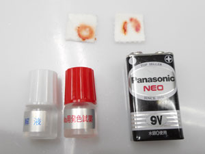 検出液を電解紙の上にたらし電池で通電させ、電解紙の黄色くなった部分に